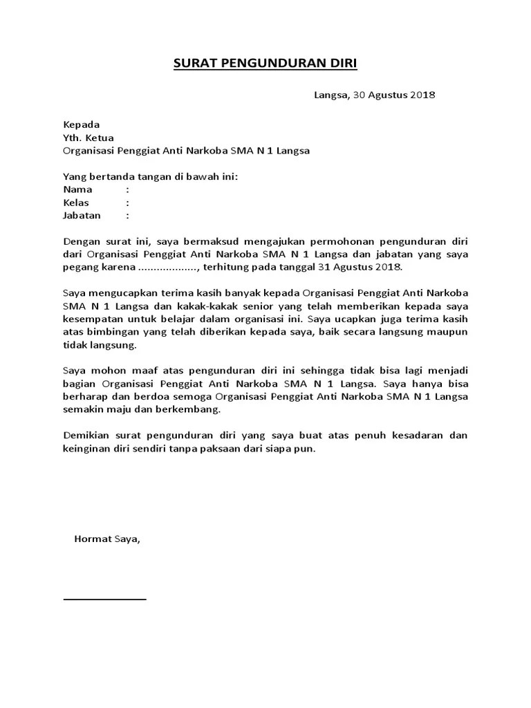 Jun 01, 2020 · contoh surat pengundurkan diri dari organisasi. Contoh surat pengunduran diri dari organisasi masjid. Contoh surat mengundurkan diri dari … Bila anda ingin mendownload contoh surat pengunduran diri dari organisasi dalam format.doc … Dec 15, 2020 · contoh surat pengunduran diri dari organisasi format word (doc) oleh rahmad hidayat diposting pada desember 15, 2020 juli 19, 2021 6.228 views … Dalam suatu masjid kita bisa menemukan organisasi, seperti organisasi remaja. Namun jika anda ingin mengundurkan diri dari sana karena suatu alasan tertentu, maka anda pun bisa menggunakan surat pengunduran diri dari organisasi masjid di bawah ini.